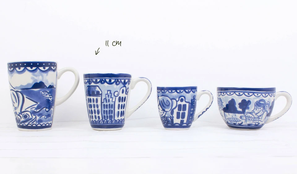 Ook zo dol op Holland? Dan zijn de bekers van het Delfts Blond’ servies helemaal geschikt voor jou. Een servieslijn met Blond interpretatie op het traditionele Delfts blauw. De illustraties zijn geïnspireerd op typische Hollandse tafereeltjes zoals schaatsen, fietsen in Amsterdam en varen.