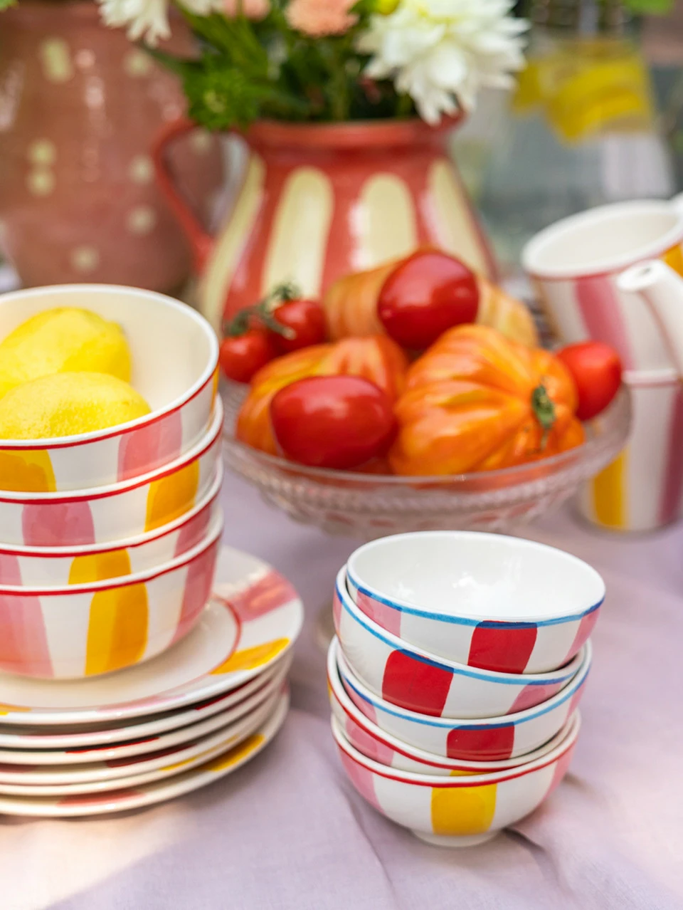 Deze kom op voet van 11.5cm uit de Even Bijkletsen, Everyday Stripes collectie combineert frisse roze en rode strepen met het vertrouwde Blond gevoel. Perfect voor een bakje chips, een bolletje ijs als toetje of alle punaises op je bureau. De zachte strepen geven rust op tafel, en dankzij het tijdloze design combineer je deze schaaltjes moeiteloos met álle Blond collecties. Mix & match, elke dag opnieuw. Every line, every time, everyday.