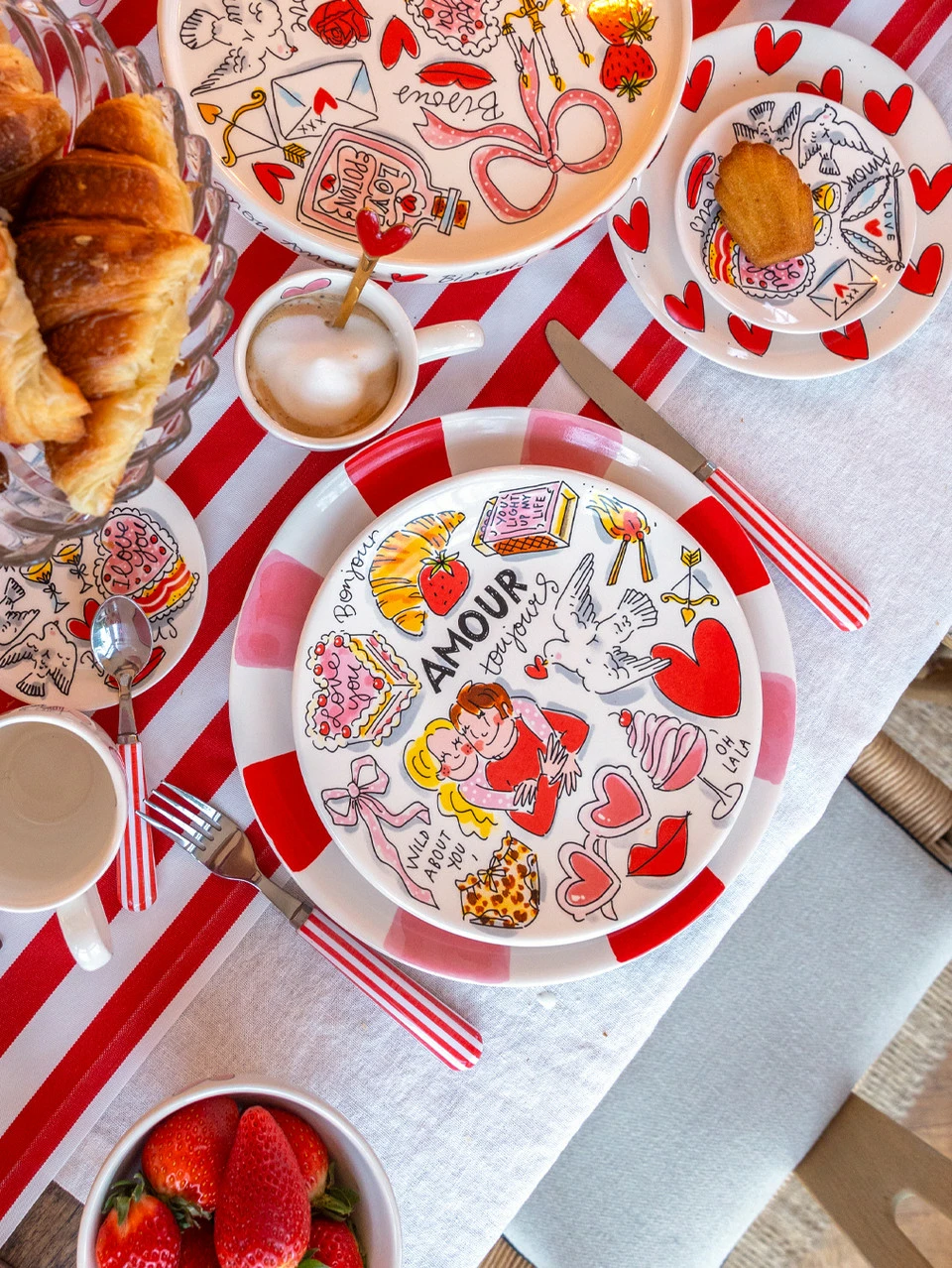 Dit 22cm Valentijnbord straalt Amour toujours uit. Een explosie van romantische clichés in de allerleukste vorm: croissants, kussende koppels, liefdesduiven, zoete taartjes en Franse teksten die je meteen laten wegsmelten. Perfect voor ontbijt op bed (met héél veel kruimels, want dat hoort nu eenmaal bij croissants), een zelfgebakken taartje of als vrolijke eyecatcher op tafel. De vrolijke illustraties passen helemaal binnen de romantische Valentijncollectie van Blond Amsterdam die draait om brieven, duiven, kussen en Franse charme. Gemaakt van hoogwaardig aardewerk/keramiek. Geschikt voor magnetron en vaatwasser, al blijft de print nóg mooier bij handwas.