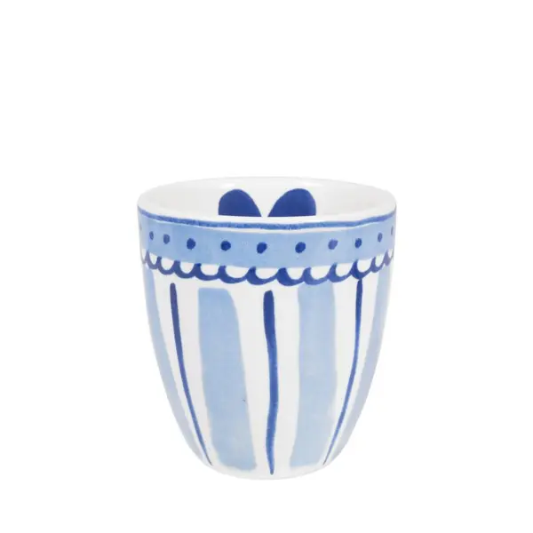 Nieuw is dit fijne mokje zonder oor. Op deze mok staan speelse strepen in verschillende kleuren blauw. In de mok staat een blauw hart. Leuk om te combineren met onze andere nieuwe geruite minimok. Een ideale mok voor een kopje koffie!