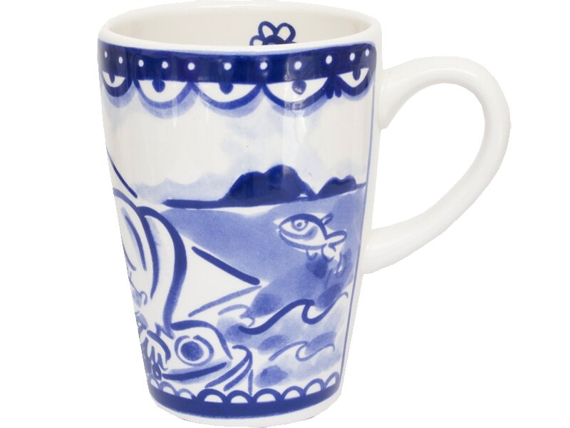 Ook zo dol op Holland en theedrinken? Dan is deze XL beker van het ‘Delfts Blond’ servies helemaal geschikt voor jou. Een servieslijn met Blond interpretatie op het traditionele Delfts blauw. De illustraties zijn geïnspireerd op typische Hollandse tafereeltjes zoals schaatsen, fietsen in Amsterdam en varen.