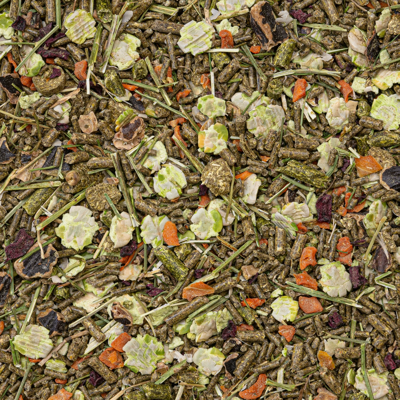 Samenstelling: Zonnebloemzaadmeel, luzerne, erwtenvlokken, bietenpulp, johannesbrood, timotee hooi (5%), kool- en raapzaadmeel, wortel gedroogd (4%), luzernestro (3%), (suiker)bietmelasse, rode biet gedroogd (2%), palmolie, peterselie (1%), monocalciumfosfaat, natriumchloride, calciumcarbonaat
