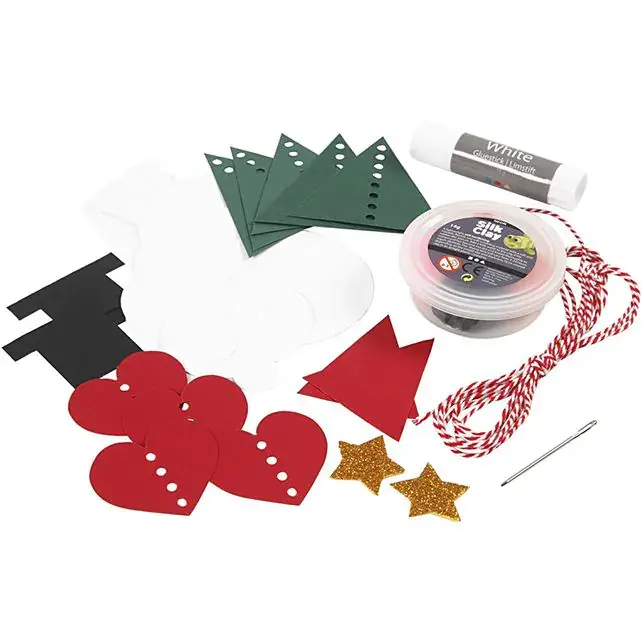 De knutselset bevat veel verschillende creatieve materialen. In de set zit silk clay in 4 kleuren, diverse vormen van karton, zelfklevende sterren van EVA foam met glitter en een ophangkoord.