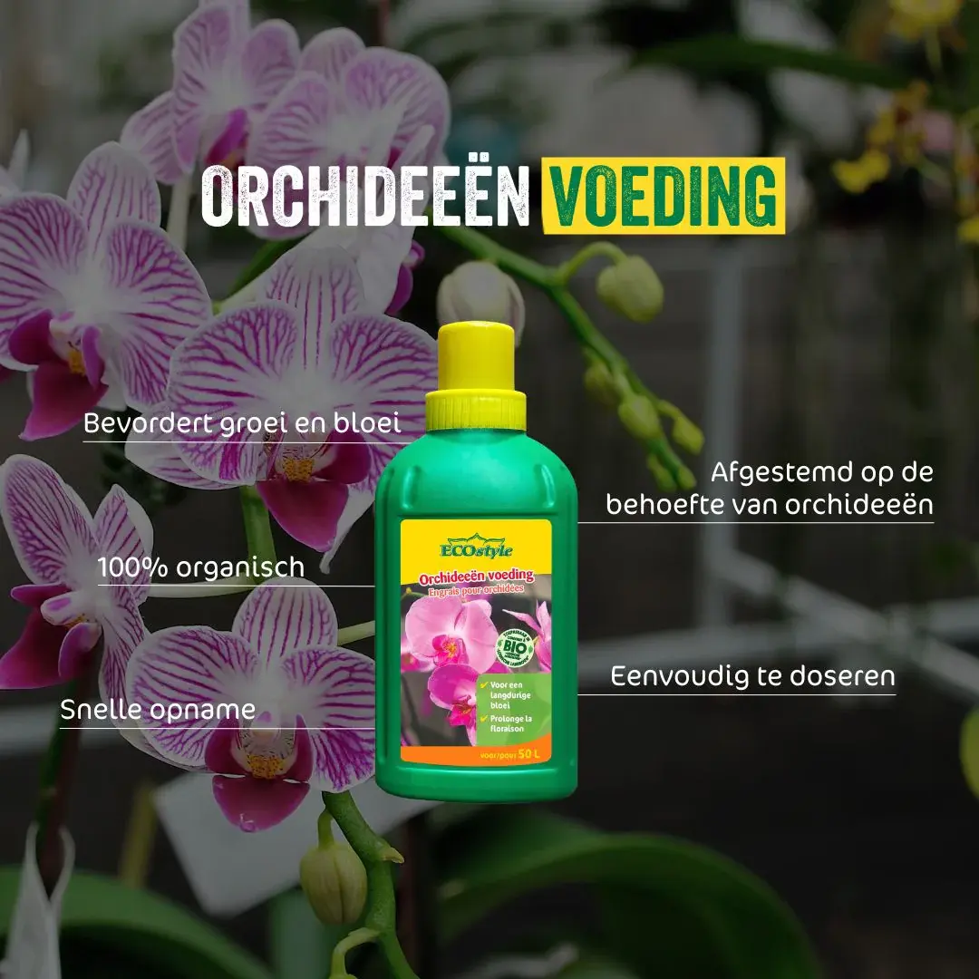 In de natuur worden planten voorzien van voeding door compost. Aangezien orchideeën in een pot staan, raakt de grond op den duur uitgeput. Daarom is het belangrijk om de voedingsstoffen aan te vullen met plantenvoeding. Zo kan je plant weer verder groeien en is deze minder vatbaar voor ziektes en plagen. Orchidee voeding verhoogt de weerstand en geeft de bloem een intense kleur. De vloeibare Orchideeën voeding bevat specifiek op deze plantengroep afgestemde voedingsstoffen, mineralen en sporenelementen.