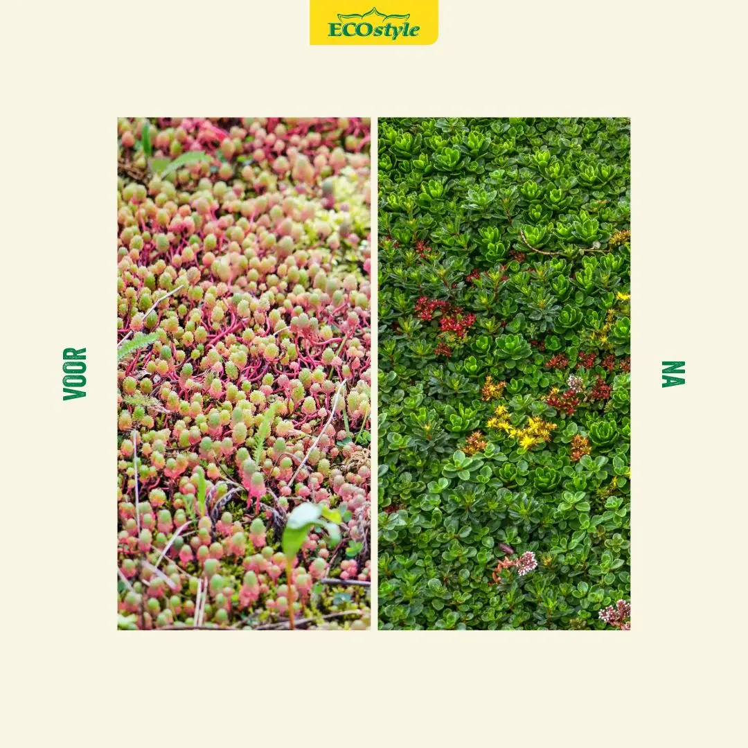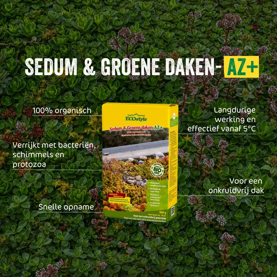 Een groendak met bijvoorbeeld sedum heeft vaak een dun laagje grond om in te wortelen. Een te kort aan water en voedingsstoffen wordt op een groendak snel zichtbaar. Als de sedumplantjes niet in optimale conditie verkeren, wordt het dak minder dicht en kleurt het rood. Ook krijgt mos en onkruid kans om te groeien. Het verwijderen van mos en onkruid en het bemesten van het groendak behoort tot het noodzakelijke onderhoud. ECOstyle Sedum en Groene daken-AZ is speciaal hiervoor ontwikkelt.
