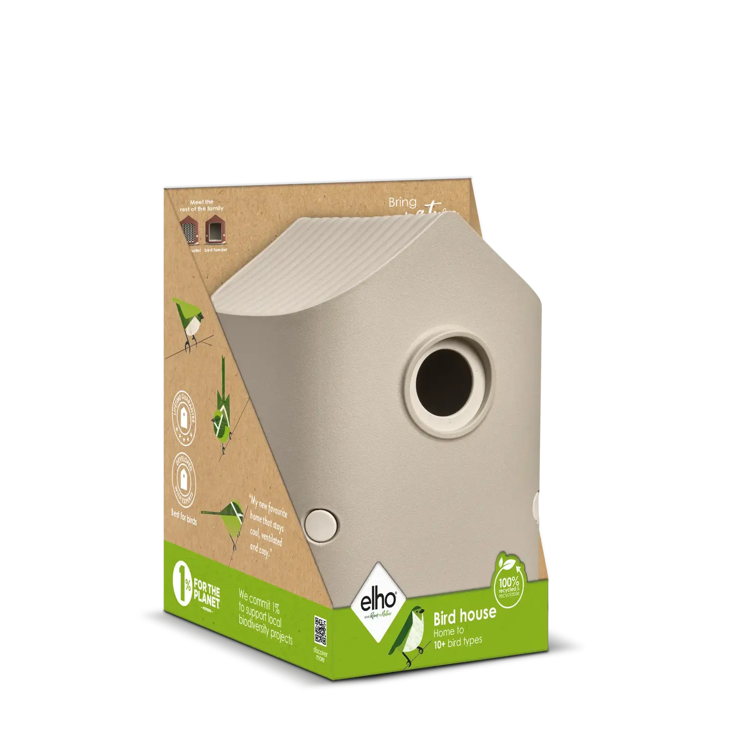 Bij elho staat duurzaamheid voorop. De cosy bird house is gemaakt van 100% gerecycled plastic en energie uit onze eigen windmolen. Zo help je niet alleen de vogels in je tuin, maar draag je ook bij aan een groenere wereld.