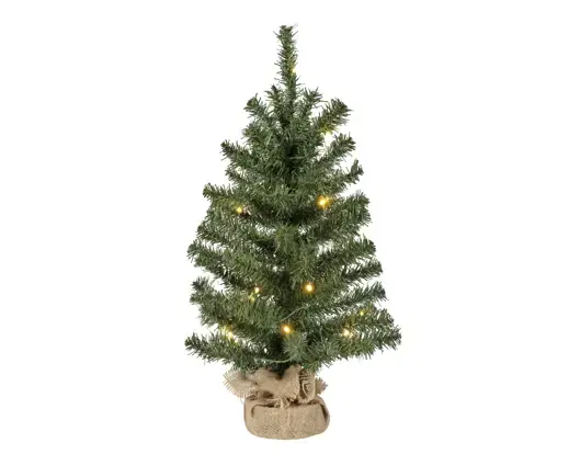 Deze sierlijke kunststof LED kerstboom is geschikt voor gebruik binnenshuis en brengt de kerstsfeer bij jou binnen. Als de 20 micro LED lampjes branden geven ze warm wit licht en hierdoor geeft de kerstboom een zeer antieke uitstraling. De voet van de LED kerstboom is afgewerkt met een jutte zak.