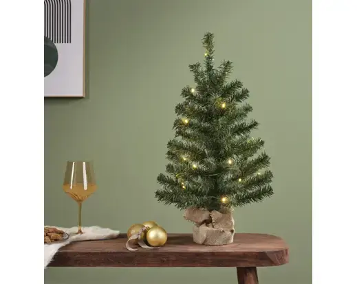 Deze sierlijke kunststof LED kerstboom is geschikt voor gebruik binnenshuis en brengt de kerstsfeer bij jou binnen. Als de 50 micro LED lampjes branden geven ze warm wit licht en hierdoor geeft de kerstboom een zeer antieke uitstraling. De voet van de LED kerstboom is afgewerkt met een jutte zak.
