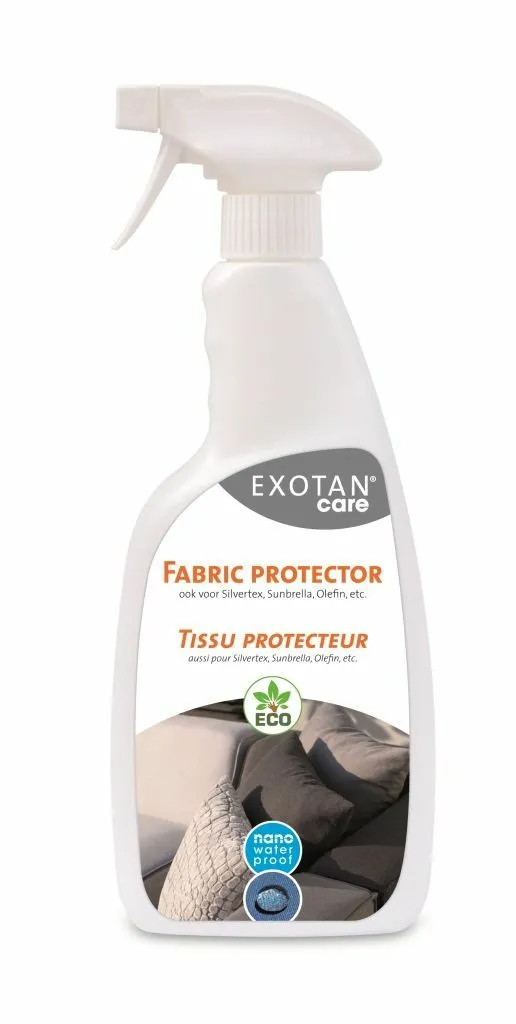 Gebruik de Exotan Care Fabric Protector voor betere bescherming van kussens, parasoldoek, luifels, etc. Maakt textiel water- en vuilafstotend en helpt vlekken voorkomen. Geeft kussens een langdurige bescherming tegen vuil, vet, olijfolie, koffie etc. Het is een onzichtbaar impregneermiddel met een UV-Block waardoor de nieuwe uitstraling van stoffen langer behouden blijft. Geschikt voor Olefin, Spunpoly, Silvertex & Sunbrella.