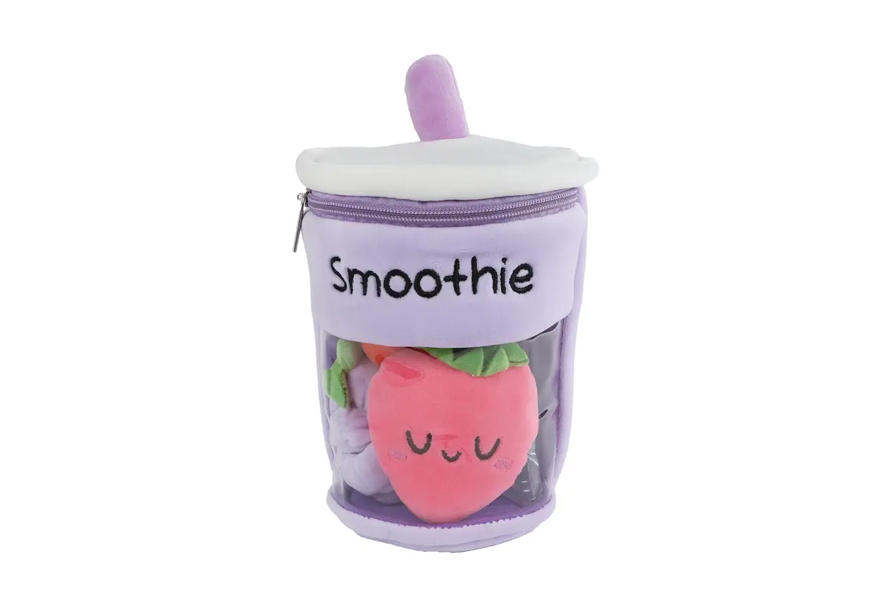 Fluffy Menu pluche smoothie van 20 cm met rits en 3 kleine pluche fruitstukjes. Gemaakt van zacht materiaal. Geschikt voor kinderen vanaf 3 jaar.