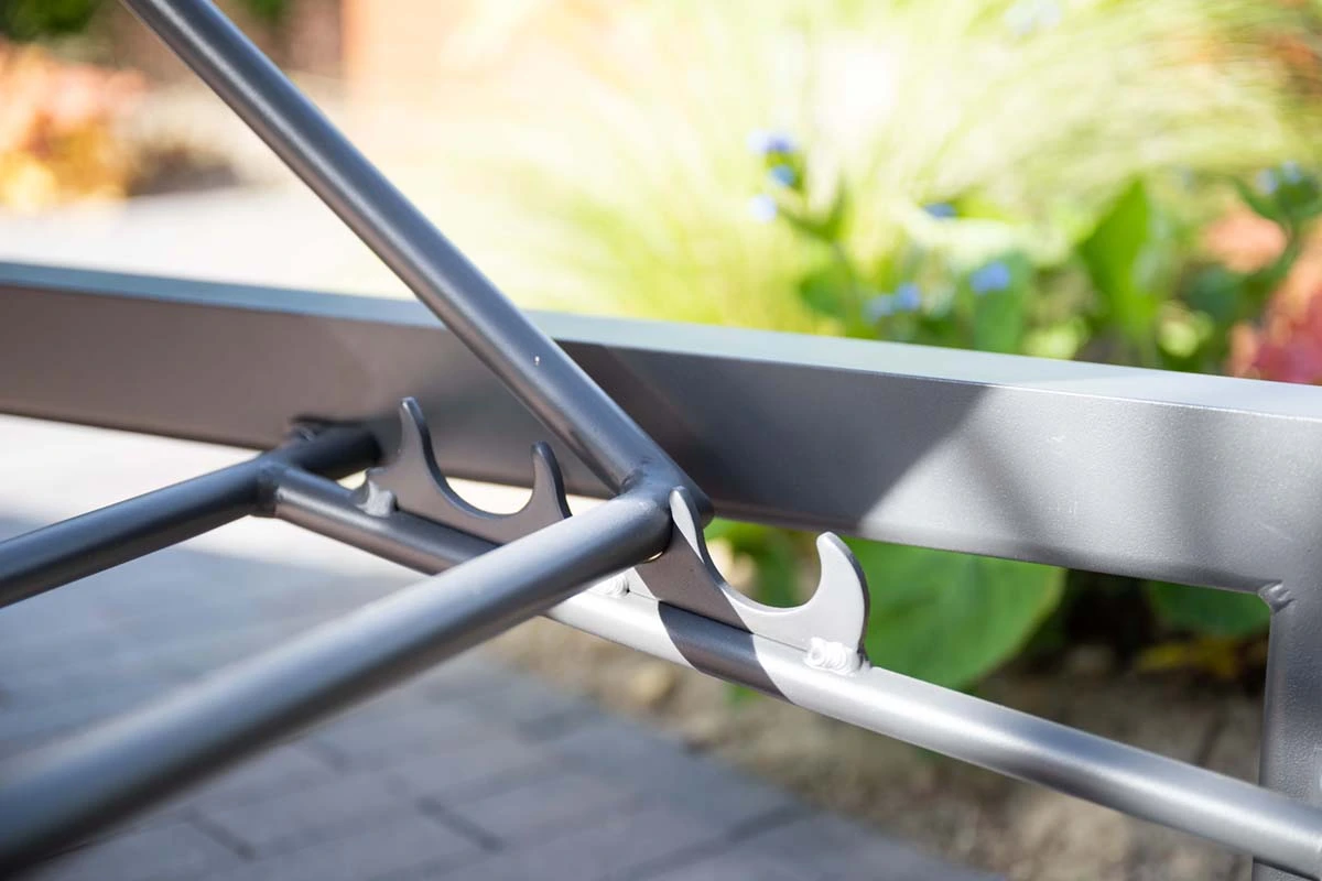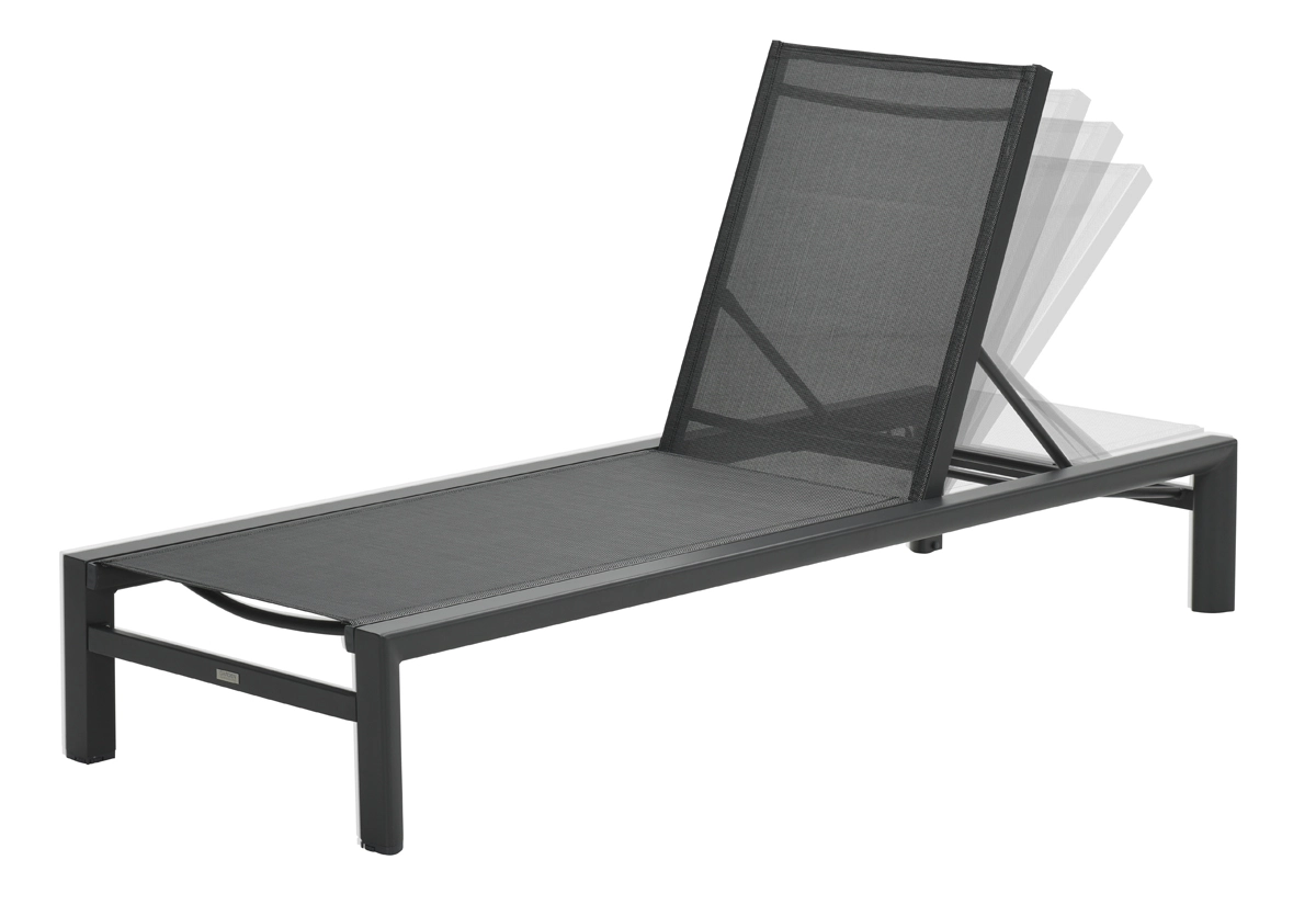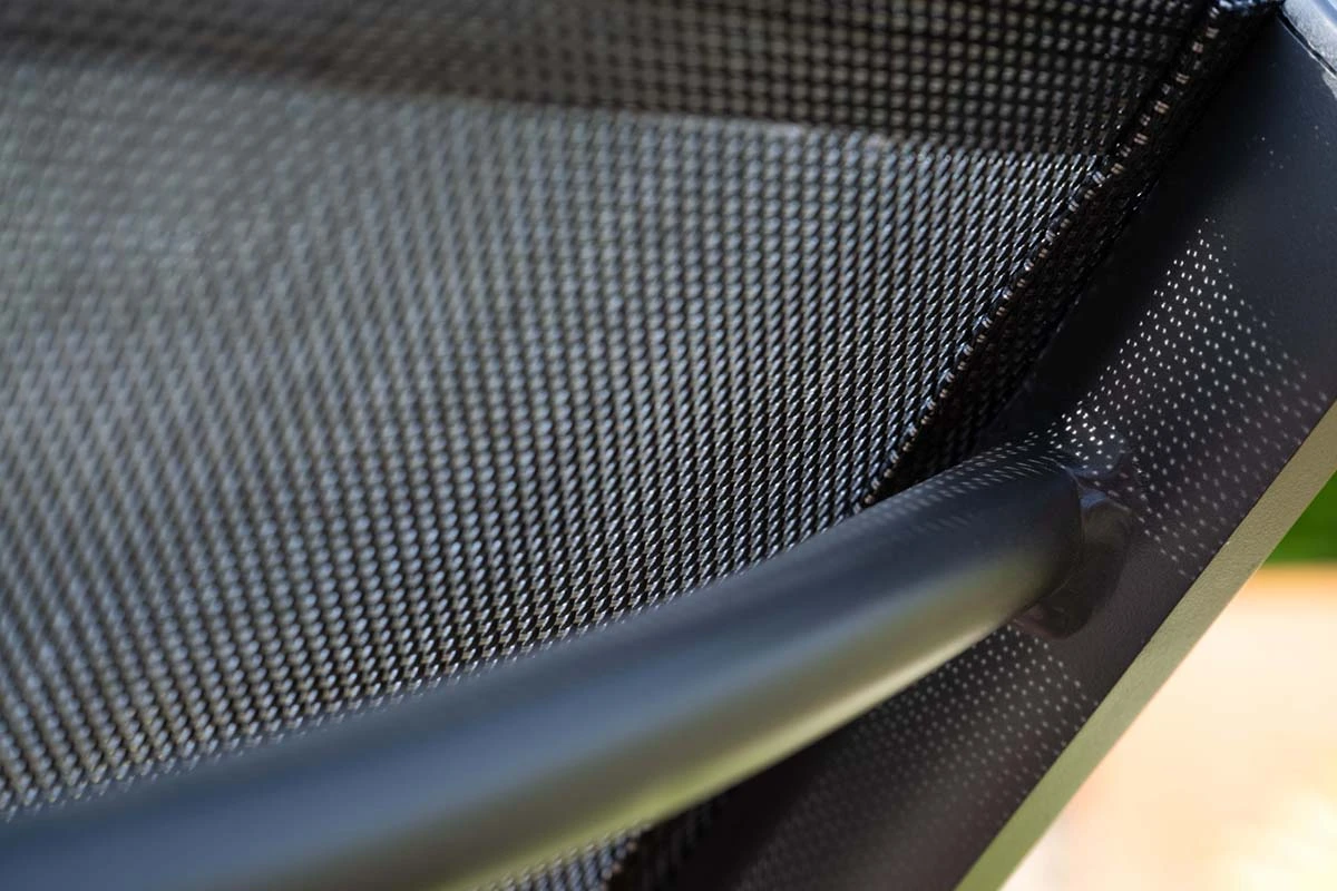 De zitting en rugleuning zijn uitgevoerd in textileen, een sterk en ademend materiaal dat snel droogt na een regenbui. Hierdoor blijft het ligbed comfortabel en direct weer klaar voor gebruik.