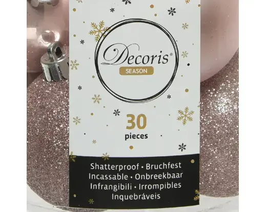 Kerstballen plastic glans-mat-glitter poederroze. 30 stuks per verpakking.
