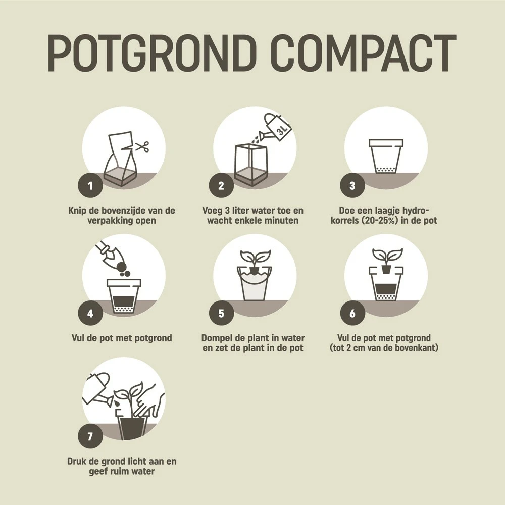 Om deze grond te kunnen gebruiken, voeg je 3 liter water toe aan de verpakking en binnen enkele minuten is de grond klaar voor gebruik. Geschikt voor alle planten: voor het aanplanten in de border en voor het oppotten binnen en buiten.