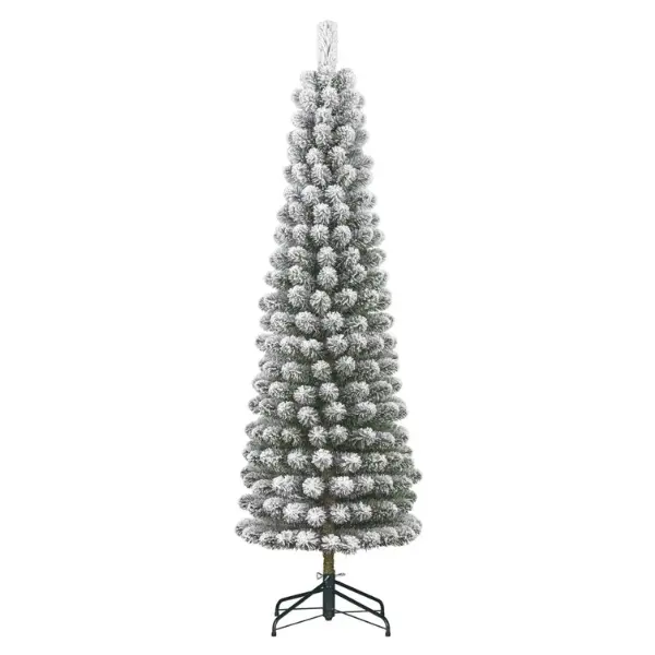 De takken zijn voorzien van een subtiele sneeuwlaag, waardoor de boom eruitziet alsof hij rechtstreeks uit een besneeuwd bos komt. Met zijn smalle diameter neemt de boom weinig ruimte in, terwijl hij toch voldoende volume heeft om te versieren met kerstballen, slingers en verlichting naar keuze.