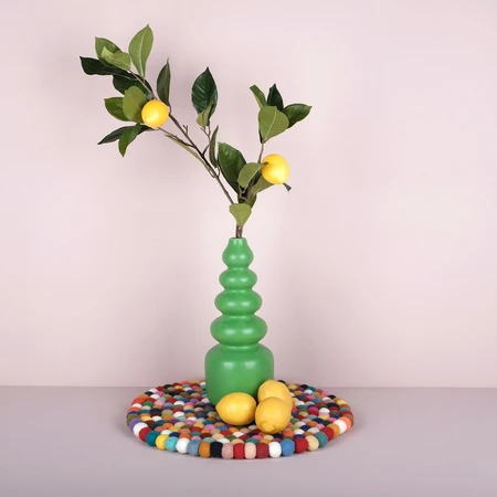 Deze vrolijke onderzetter is gemaakt van verschillende kleuren vilten balletjes. De doorsnede is 40 cm. Wordt veel gebruikt als zitting op een stoel. Staat ook erg leuk met een vaas bloemen erop of als kleedje onder een bijzettafeltje!