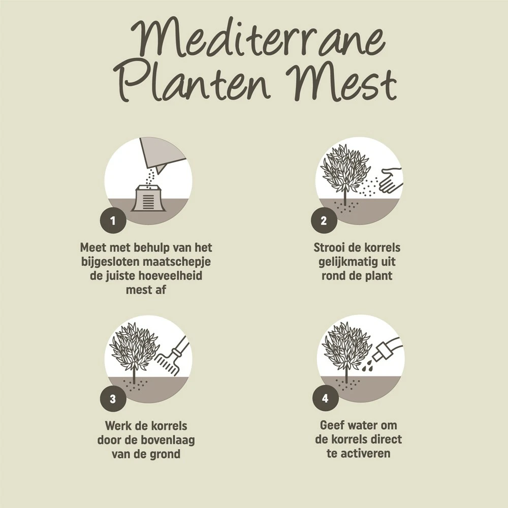 Daarnaast wordt je mediterrane plant sterk en gezond door extra humusextracten en een plantaardige biostimulant. Hierdoor kan je plant de voeding beter opnemen. Magnesium (MgO) en IJzer (Fe) zorgen ervoor dat de groene kleur van de bladeren nog intenser zal zijn.