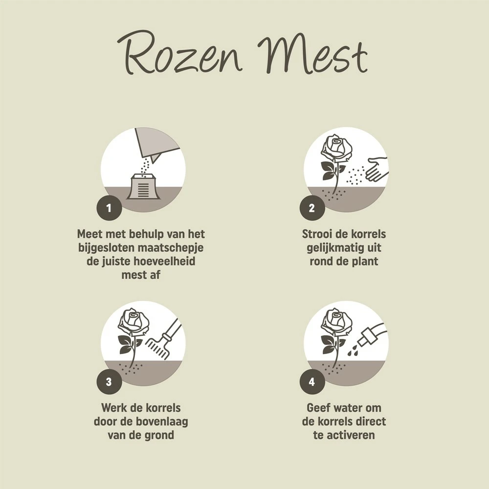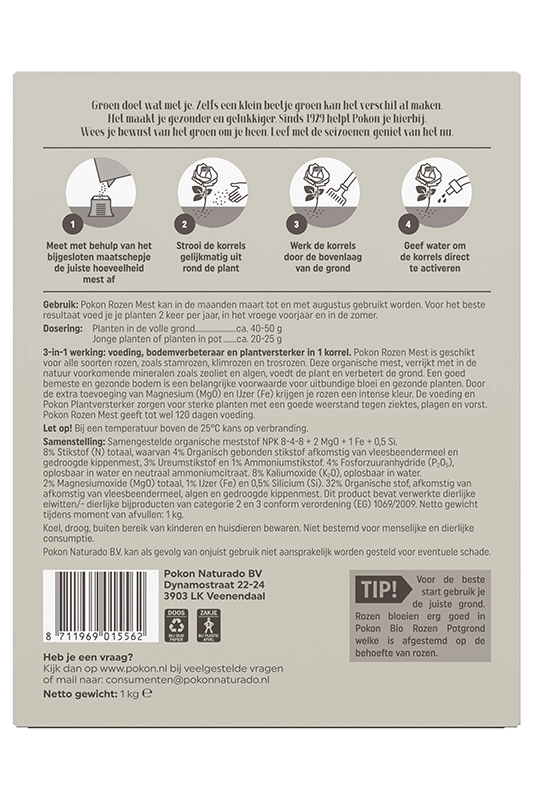 Pokon Rozen Mest, verrijkt met in de natuur voorkomende mineralen (zeoliet en algen), voedt de plant en verbetert de grond. De organische voeding zorgt ervoor dat je rozen goed groeien en meer weerstand krijgen. Door de extra toevoeging van Magnesium (MgO) en IJzer (Fe) krijgen je bloemen een intensere kleur.