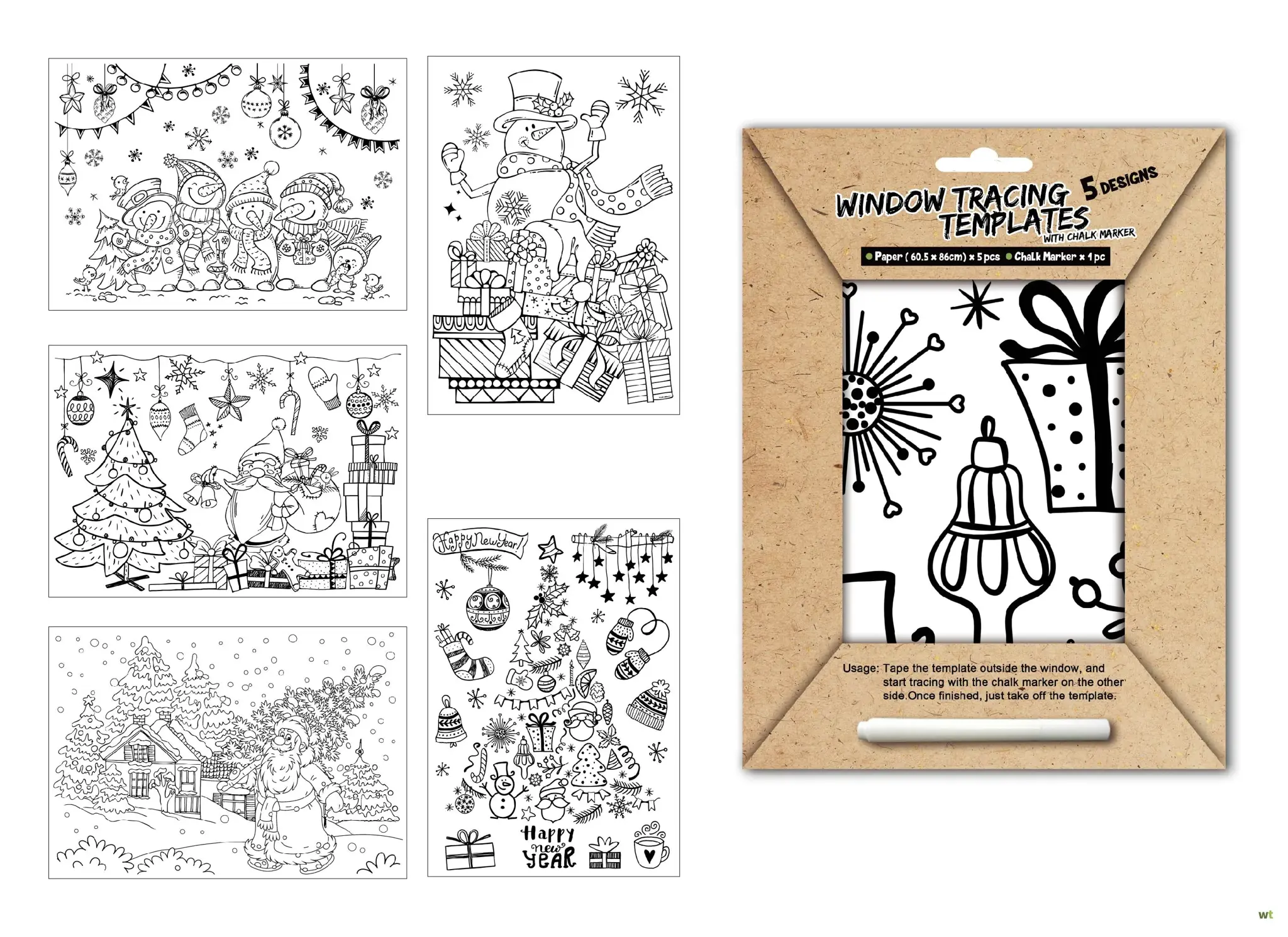5 Posters (60,5X80CM) om over te trekken. Wordt geleverd met 3 Kalk stiften