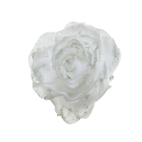 Sfeervolle roos met clip in de kleur winterwit. Deze zijderoos is geschikt voor de versiering van je kerstboom of leuk te combineren met andere items als kerstfiguren, kersthangers en kerstslingers. De roos heeft een diameter van 14 cm. Door het clipje aan de bloem is bevestigen super simpel. Heb je kinderen en of huisdieren? Dan is deze roos ideaal want bijna niet kapot te krijgen. Haal de kerst in huis met deze sfeervolle roos met clip. Je kunt de roos ook gebruiken als piek voor in je boom.