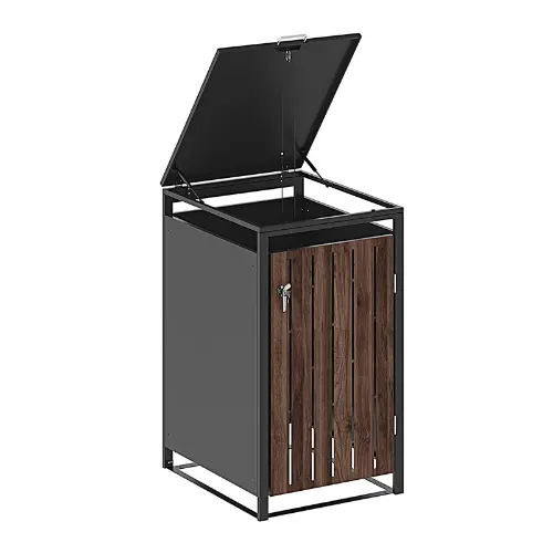 De Containerbox is een stijlvolle oplossing om een afvalcontainer netjes uit het zicht te plaatsen. De combinatie van antraciet staal en een deur met walnoot houtlook zorgt voor een moderne uitstraling in de tuin of op de oprit. Geschikt voor containers van 120 of 240 liter en voorzien van een praktisch deksel met gasveren voor eenvoudig openen. Ideaal voor huishoudens die hun buitenruimte strak en opgeruimd willen houden.