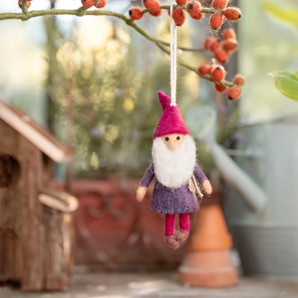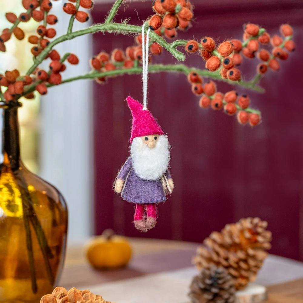 Deze vilten kabouter draagt een paars jasje met een burgundy puntmuts. Perfect voor wie houdt van rijke kleuren en een warme, gezellige sfeer. Leuk aan een tak of in de kerstboom.