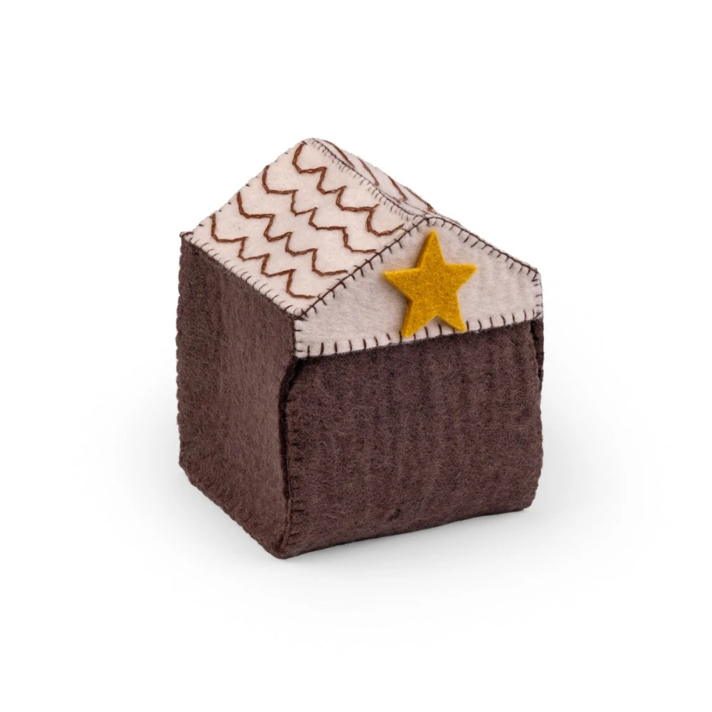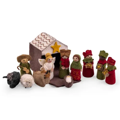 Deze vilten kerststal is met de hand gemaakt door vrouwen in Nepal.