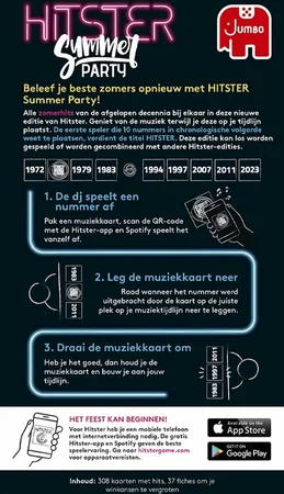 Duik volledig in de zomerse sfeer met Hitster Summer Party! Alle zomerhits van de afgelopen decennia komen samen in deze nieuwe editie van Hitster. Geniet van de muziek terwijl je deze op jouw tijdlijn plaatst. De eerste speler die met succes 10 nummers chronologisch plaatst, wordt gekroond tot Hitster. Deze editie kan als zelfstandig spel worden gebruikt of worden gecombineerd met een van de andere Hitster-edities.