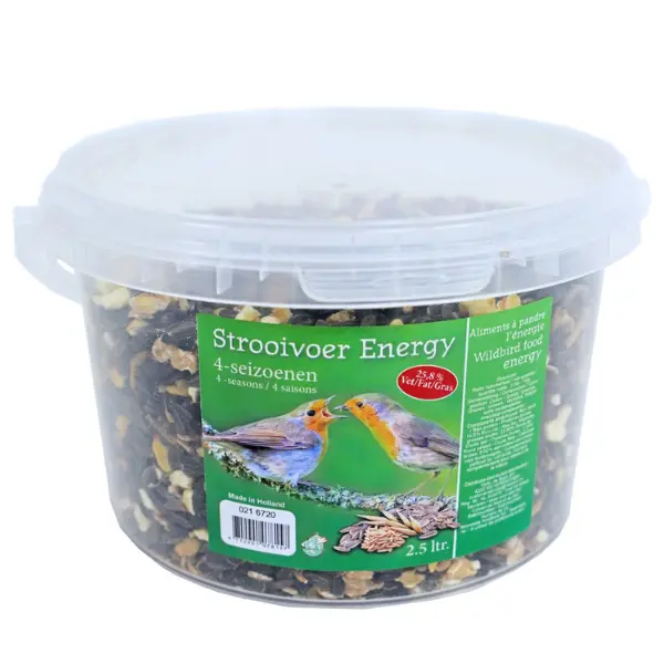 Deze vogelvoermix is te gebruiken als strooivoer of in een vogelvoederhuisje. Het voer is bijzonder voedzaam en voorzien van alle benodigde proteinen en vitaminen voor allerlei soorten tuinvogels. De ingredienten van het strooivoer zijn zo samengesteld dat ze het hele jaar door aan vogels gevoerd kunnen worden. Niet alleen de vogels zijn er dol op maar ook eekhoorntjes en egels vinden dit een lekkernij. Het energy 4-seizoenen voer zit verpakt in een hersluitbare emmer.