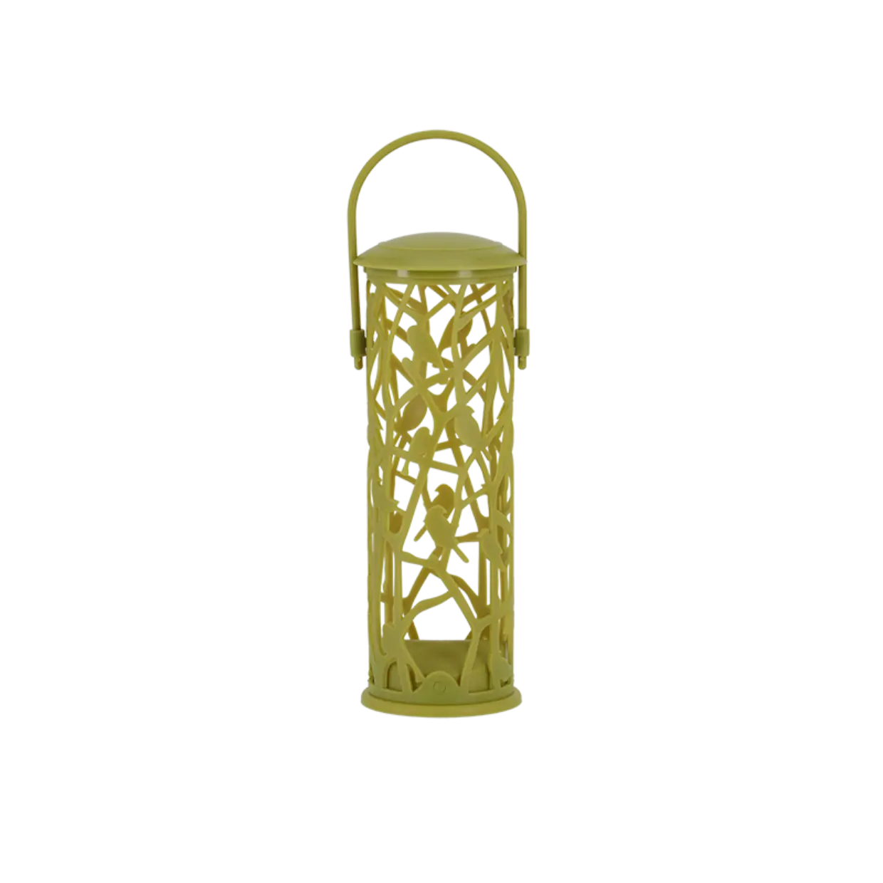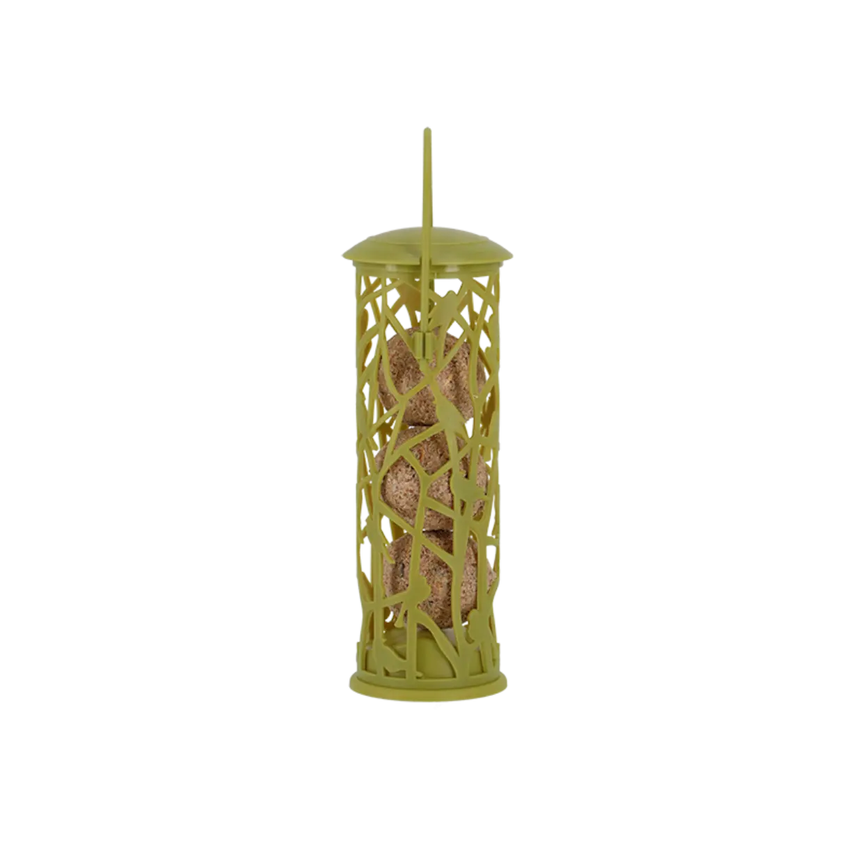 Deze vetbollensilo in trendy groen heeft een open structuur zodat de vogels gemakkelijk van het voer kunnen genieten. Door het deksel omhoog te schuiven is de silo gemakkelijk te vullen en door de grote haak eenvoudig op te hangen.