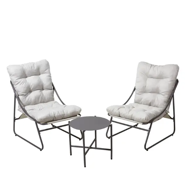 Robuuste set met donkergrijs stalen frame en lichtgrijze kussens die contrast en stijl toevoegen. Compact tafeltje inbegrepen – ideaal voor kleine buitenruimtes.