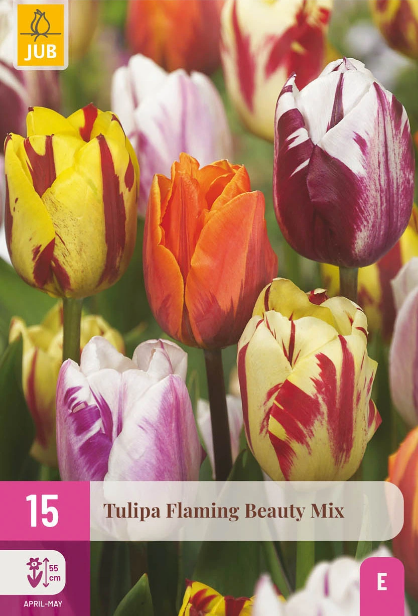 De Tulipa Flaming Beauty Mix bestaat uit opvallende tweekleurige tulpen die in april-mei bloeien. Met een hoogte van 55 cm is deze mix ideaal voor een kleurrijke groep in de border of een aantrekkelijke pot op terras of balkon.