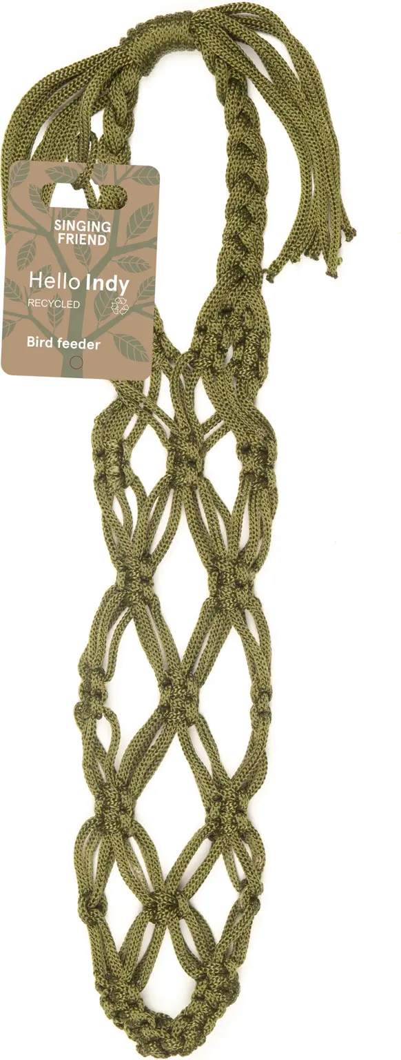 De Singing Friend Indy is een stijlvolle en duurzame voederhanger gemaakt van gerecycled PET-touw. Dankzij het macramé-ontwerp is hij eenvoudig op te hangen en geeft hij je tuin of balkon een natuurlijke uitstraling. De hanger is ontworpen om vier voederbollen te huisvesten, waardoor meerdere vogels tegelijk kunnen eten.