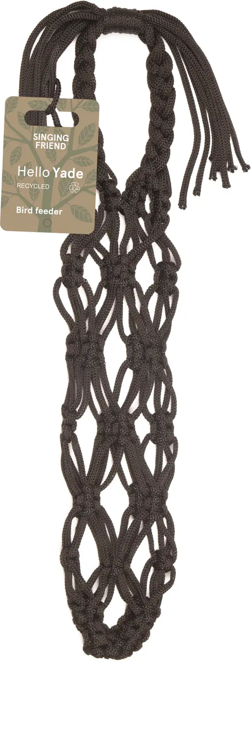 De Singing Friend Yade is een stijlvolle en duurzame voederhanger gemaakt van gerecycled PET-touw. Dankzij het macramé-ontwerp is hij eenvoudig op te hangen en geeft hij je tuin of balkon een natuurlijke uitstraling. De hanger is ontworpen om vier voederbollen te huisvesten, waardoor meerdere vogels tegelijk kunnen eten.