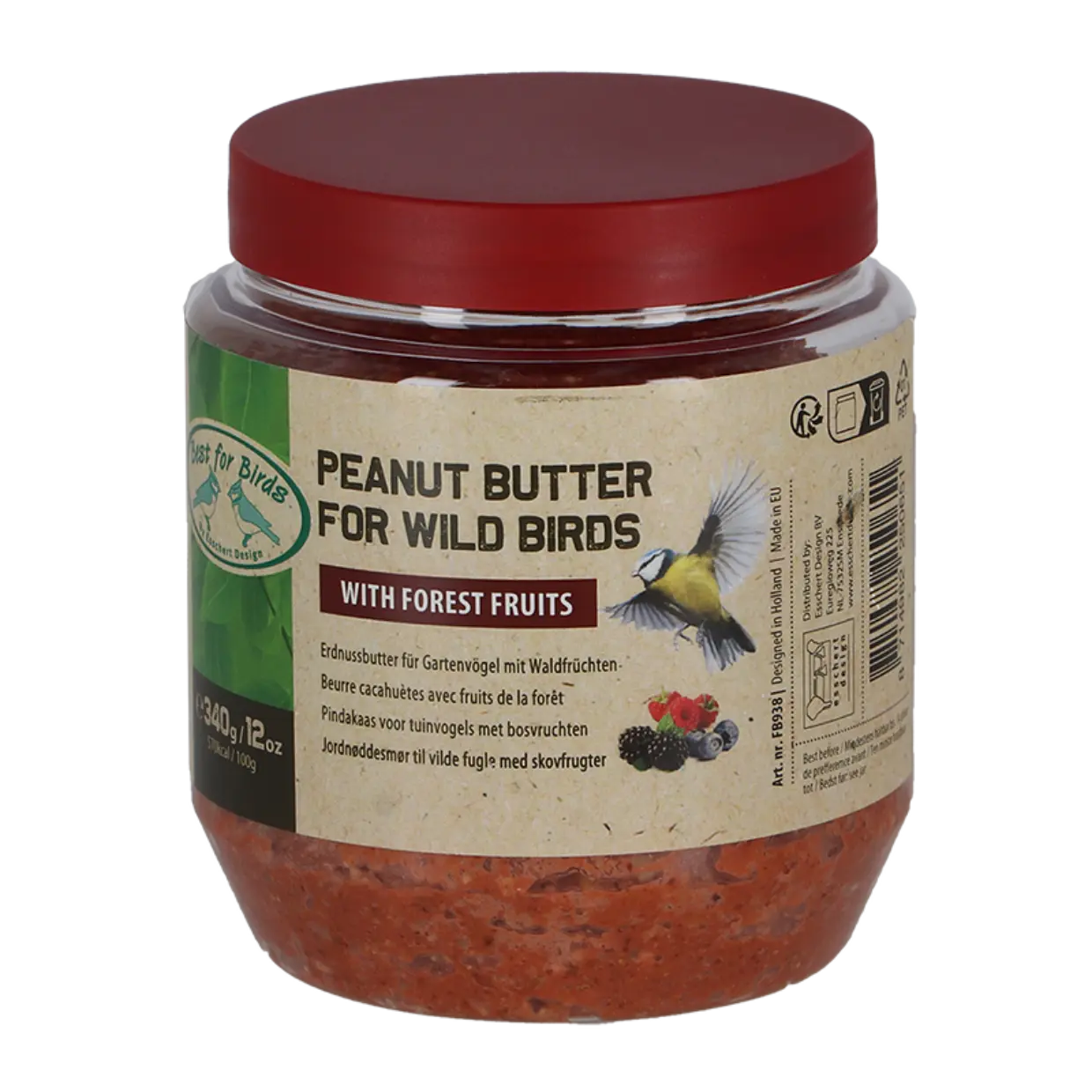 Deze bosvruchten vogelpindakaas is niet alleen voedzaam maar ook aantrekkelijk voor vogels dankzij de zoete fruitaccenten. Gebruik hem in een pindakaashuisje of bevestig de pot op een voederstation. Vermijd plaatsing op de grond om knaagdieren of insecten te ontmoedigen.