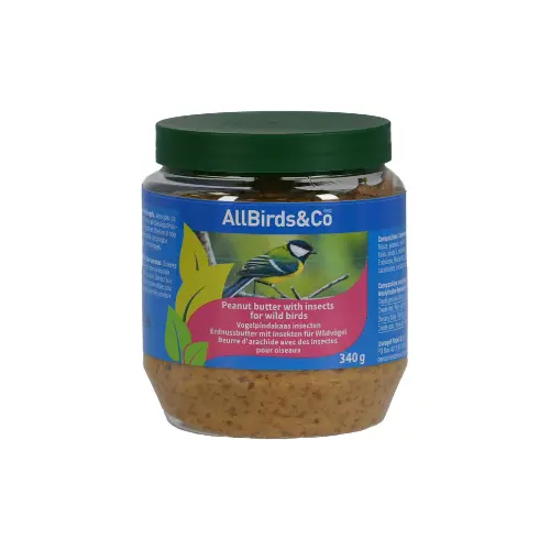 Deze pindakaas is perfect voor het voorjaar, wanneer vogels veel energie nodig hebben om een nest te bouwen en hun jongen te voeden. Ook in het najaar en de winter biedt het een belangrijke energiebron, zodat vogels een vetlaagje kunnen opbouwen voor de koude maanden. De lege pot kan gemakkelijk gerecycled worden in de glasbak. AllBirds&Co pindakaas bevat 340 g en is ook verkrijgbaar in de varianten zaden of original.