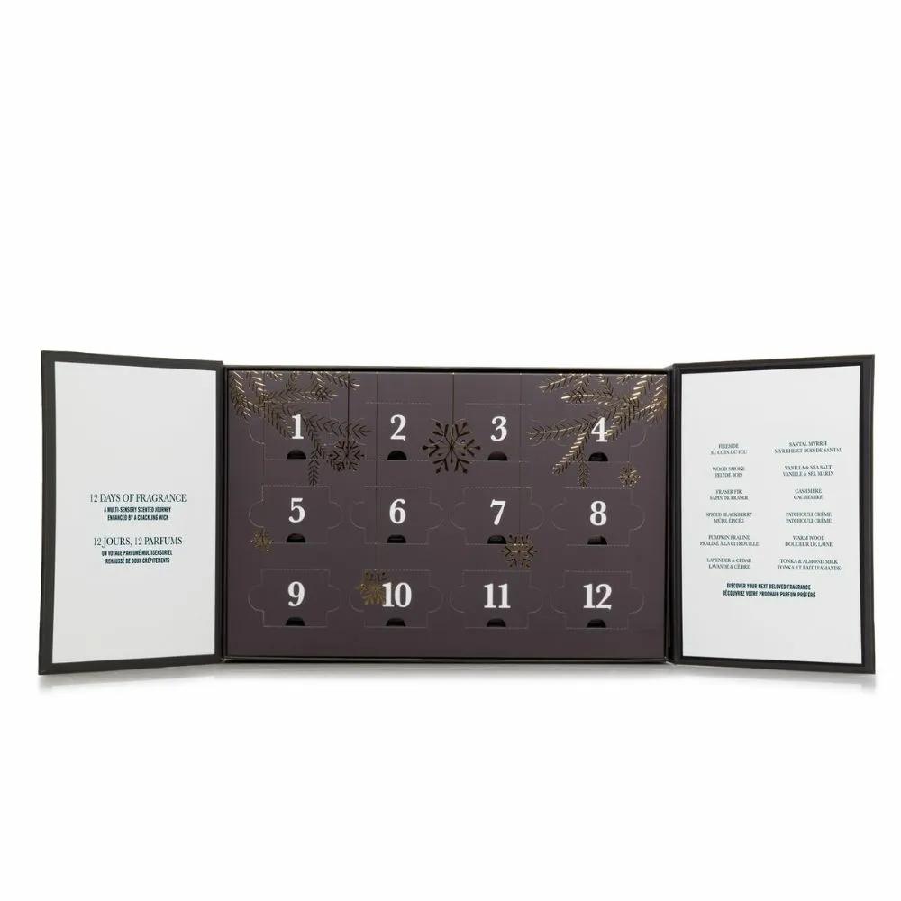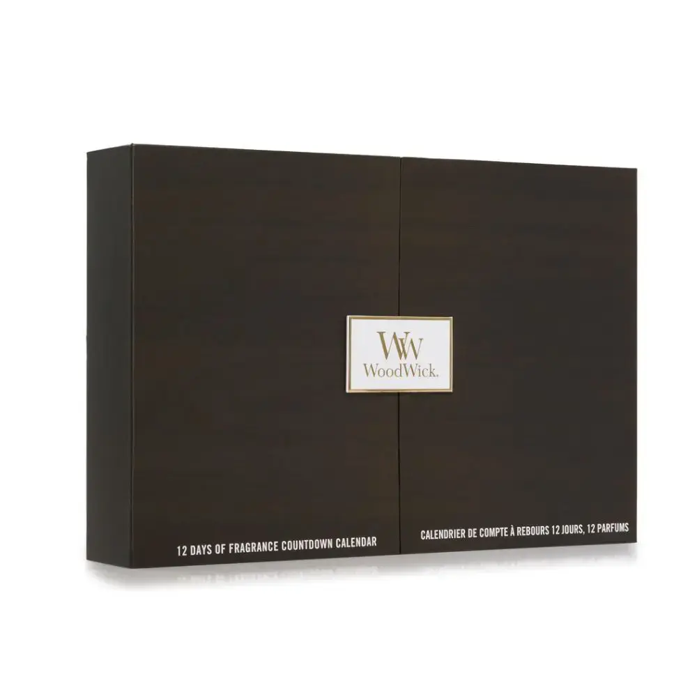 Tel af tot Kerst met de WoodWick Adventskalender Deluxe Giftset, de allereerste officiële 12-daagse adventskalender van WoodWick. Achter elk deurtje ontdek je een luxe mini-geurkaars met houten lont die tot wel 15 uur brandt. In totaal levert deze set tot circa 180 branduren geurgenot op.