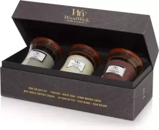 Inhoud WoodWick Deluxe Giftset 3 Mini Candle Woody